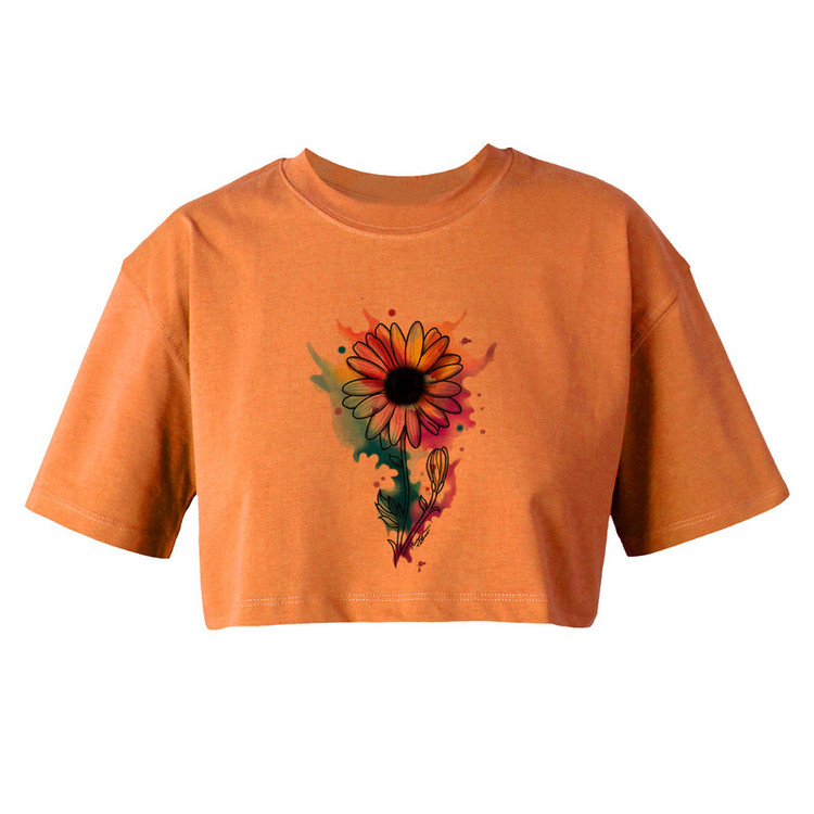 کراپ تی‌شرت آستین کوتاه زنانه مدل گل رنگی کد Da 600N رنگ نارنجی